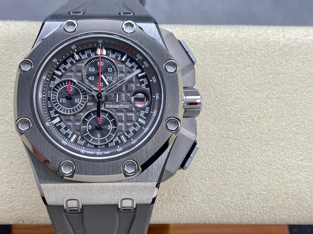 The Audemars Piguet Royal Oak Offshore Chronograph has a case diameter of 44 mm. The one-piece octagonal bezel of this watch is made of Cermet ultra-resistant porcelain, which is seven times more durable than steel, and is fixed with eight automotive-style domed embedded nuts. This watch is also equipped with a uniquely designed rubber strap (grey for titanium and rose gold models, blue for platinum models), connected by micro-beaded and satin-brushed titanium links, which are designed to imitate the cooling air intakes of racing cars, while the micro-beaded crown (made of titanium, rose gold or white gold) is made into a gear-like shape and decorated with a red anodized aluminum bridge engraved with the Audemars Piguet logo. The micro-beaded titanium bridge protects the black polished ceramic buttons, and the top of the button is made of titanium, white gold or rose gold.