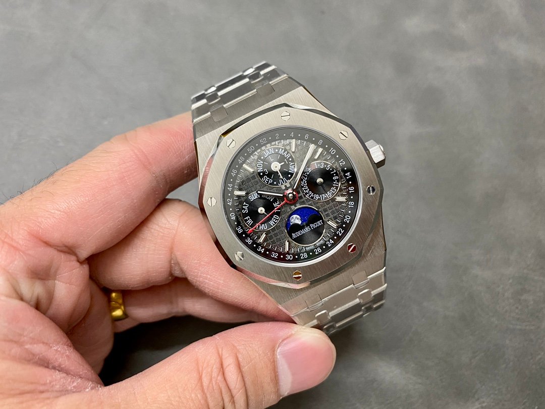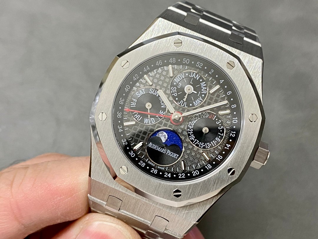 The Royal Oak Perpetual Calendar watch from Audemars Piguet, with its elegant blue dial and cool stainless steel case, perfectly reflects the high technology of Audemars Piguet’s aesthetic design and complex functions.