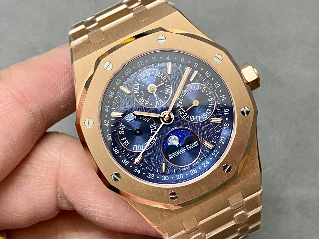 The Royal Oak Perpetual Calendar watch from Audemars Piguet, with its elegant blue dial and cool stainless steel case, perfectly reflects the high technology of Audemars Piguet’s aesthetic design and complex functions.