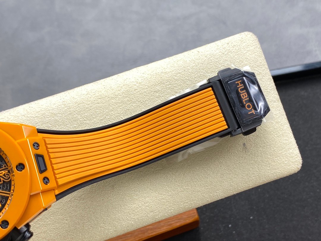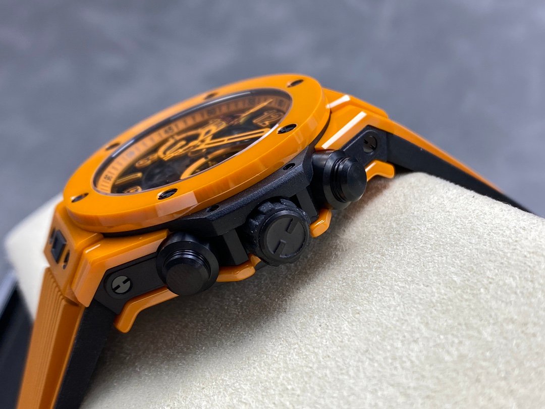 Hublot colorful ceramic watch 3-position hollow calendar ring, 3-position 60-minute timer, 8-position horizontal clutch, 9-position small second wheel, sapphire crystal mirror, rubber strap with ceramic folding clasp, colorful pattern hands with impeccable texture, 42mm