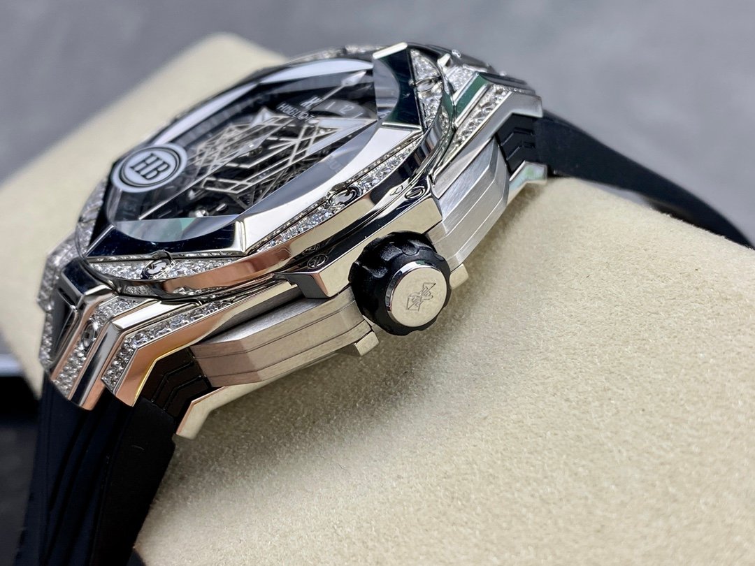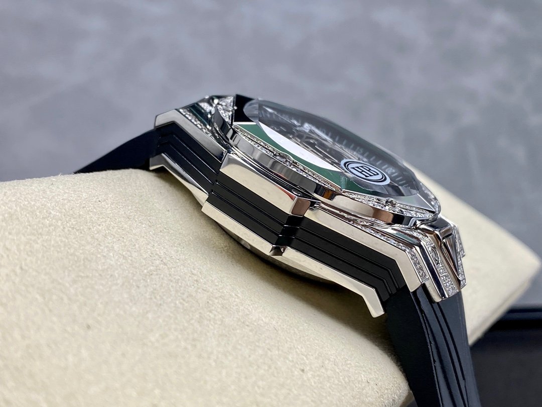 The watch perfectly reflects the brand’s ambition and design philosophy. The case is 45mm in diameter, and the graphic elements run through the case, integrated into the hexagonal bezel through cutting and engraving. The lugs have a strong sense of design, with steep angles and tough lines.