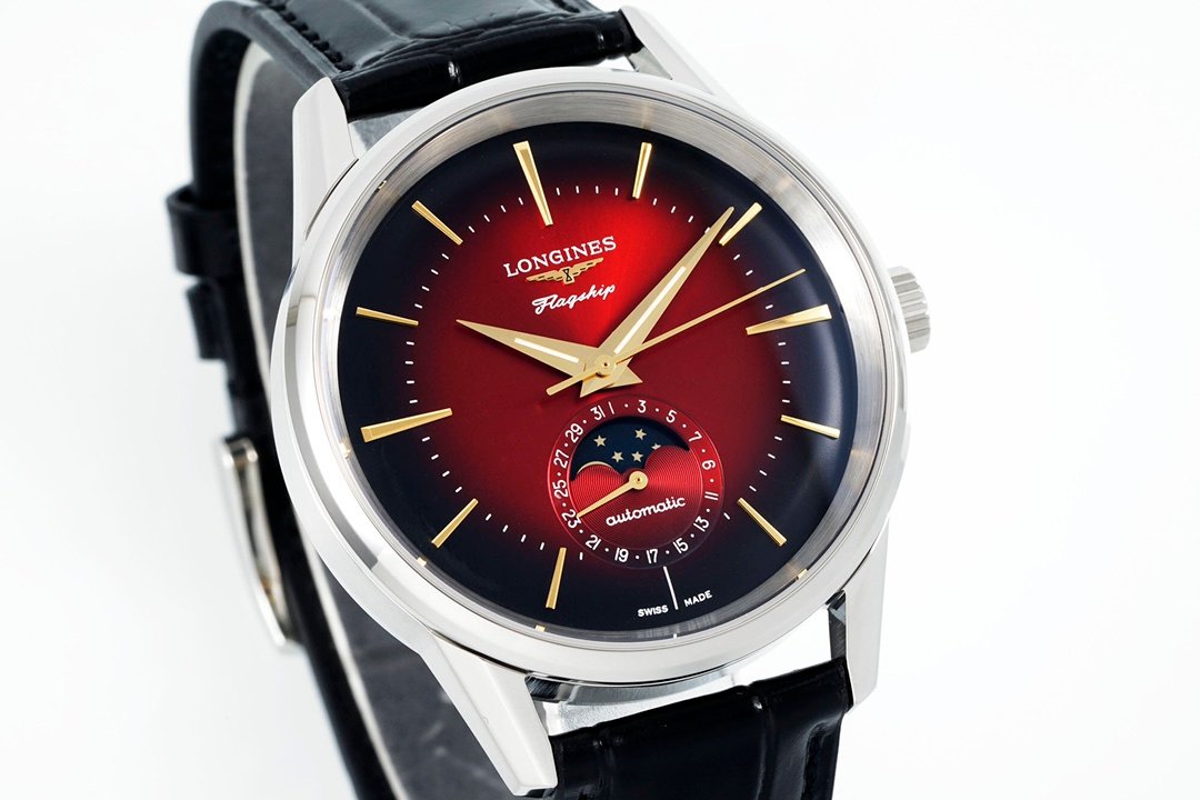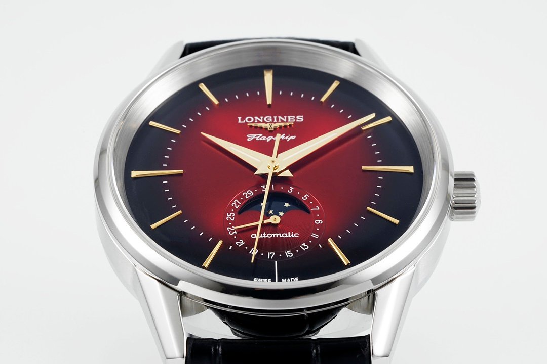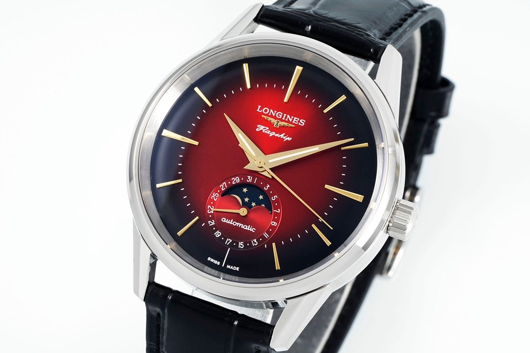 The watch is from the new classic replica series Flagship watch from Longines, equipped with a moon phase function. The Flagship series watch is a formal watch launched by Longines in the 1950s. It is loved by watch lovers for its elegant and simple style and is one of the brand’s iconic series. The design inspiration of this replica watch comes from the antique watch launched by the brand in 1975, so we can see that whether it is the 38.5 mm diameter, the special curved dial, the curvilinear “Flagship” under the brand logo at 12 o’clock, and the embossed sailboat logo on the rotating case back, all make this watch full of retro style. The integration of the new moon phase function makes this replica watch more elegant. The date display surrounds the outer ring of the moon phase disk, which increases practicality without destroying the integrity of the disk.
