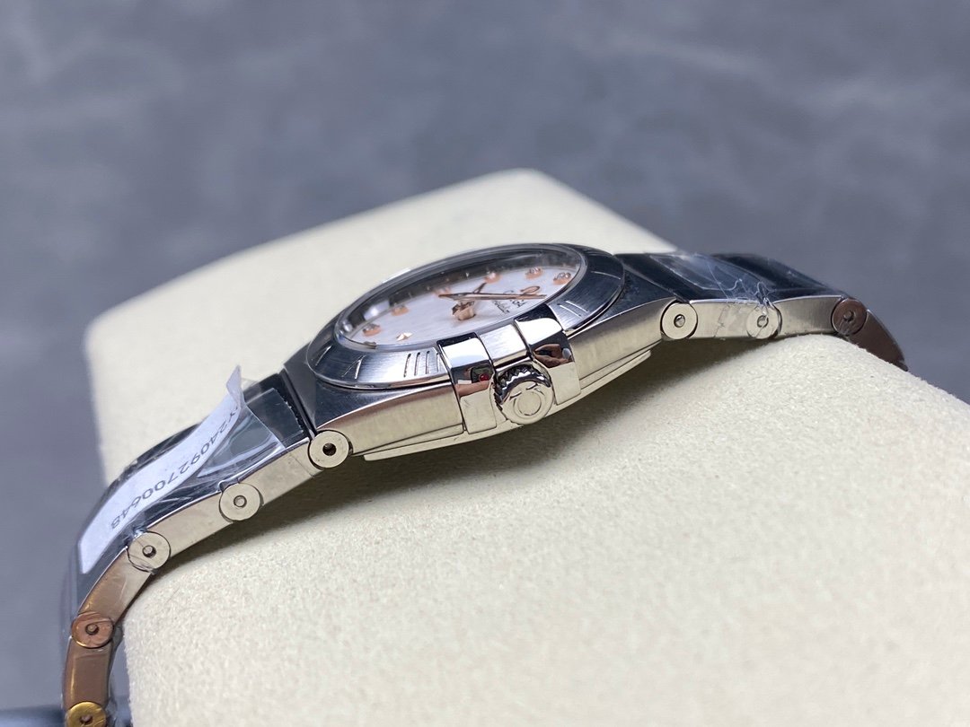 The 27 mm case is made of stainless steel and 18K red gold. The hands, diamond-set brackets and polished decorative strips on the stainless steel bracelet are also made of 18K red gold.
