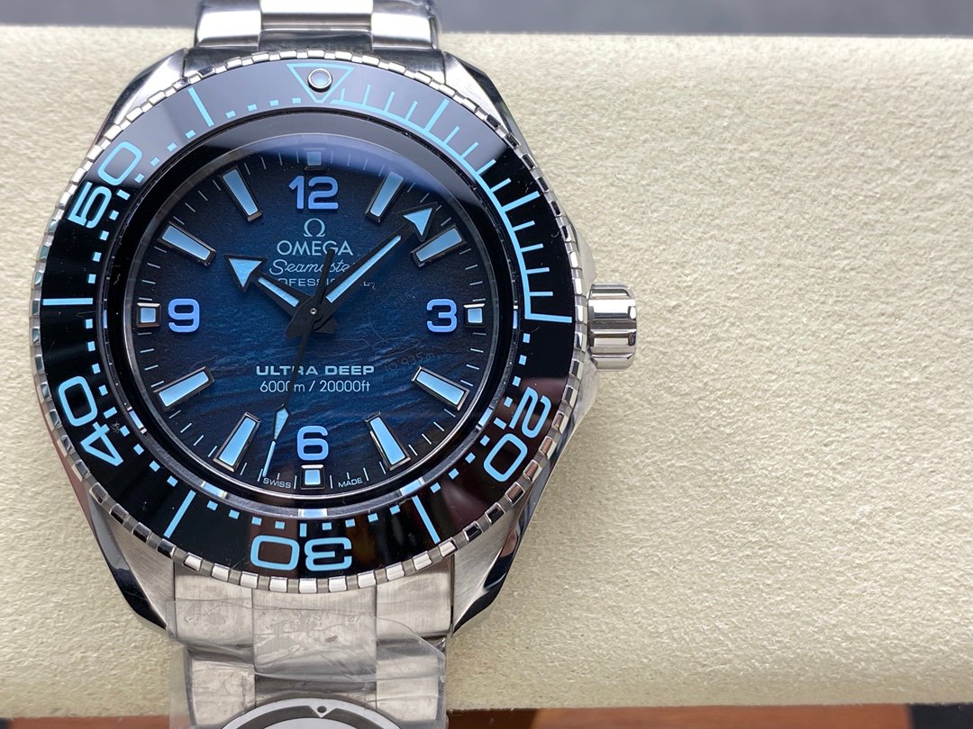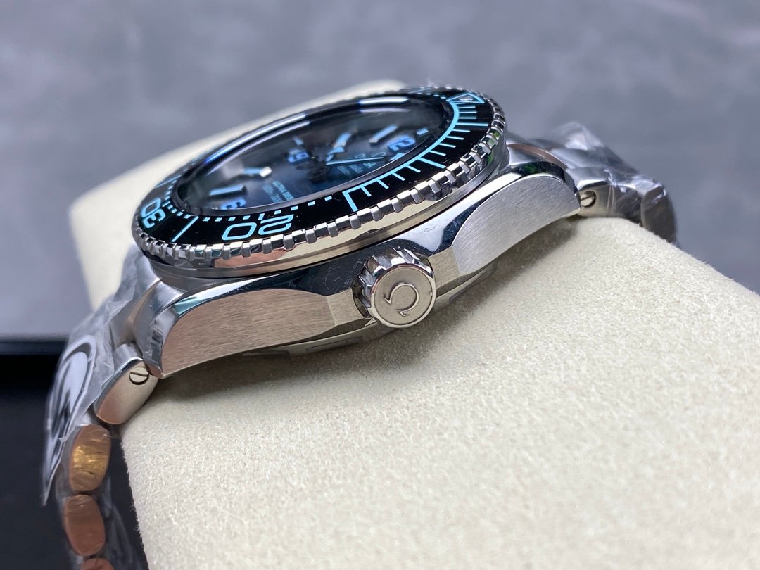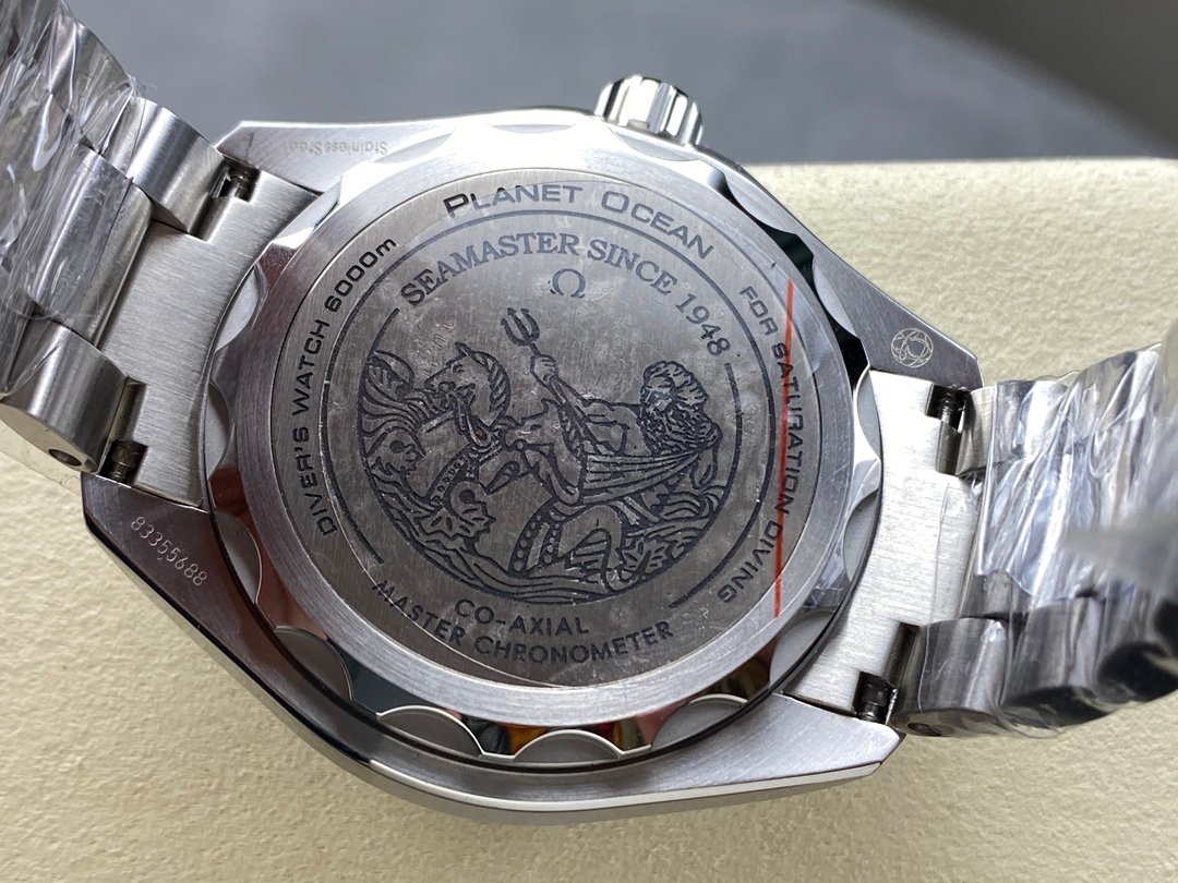 The overall design style and proportions are in line with the Ocean 600 of that year. The slightly raised conical sapphire watch mirror design can better withstand water pressure, and swimming and ordinary diving are completely stress-free! The ceramic bezel uses liquid metal filling technology, a unique design in the industry, and the physical texture will definitely make you love it! All the filling parts of the pointers and scale hour markers have super luminous display, you are the most dazzling star in the dark! The size of the entire watch is 45.5×18 mm. Thanks to the various layered designs on the bezel, case and bottom cover, the entire watch does not look as heavy as imagined from the side. In order to achieve stronger waterproofness, the screw-in bottom cover does not have a back-transparent design. The back cover is laser-printed with a never-fading Poseidon pattern according to different models. The strap has added ergonomic design, and the buckle can be fine-tuned. The entire watch is cast in the original mold, full of details.