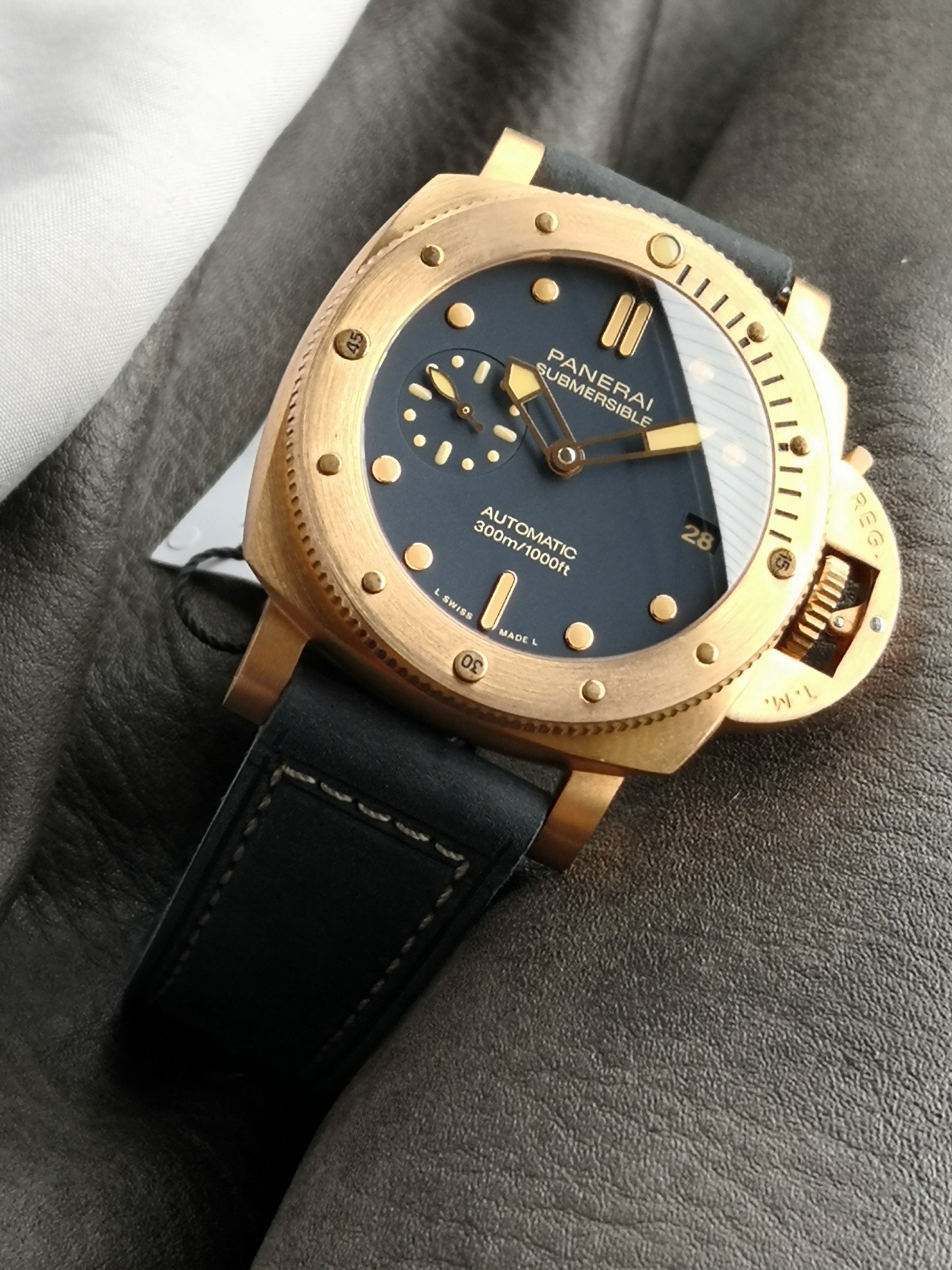 Sandblasted titanium case with blue Italian imported calfskin strap, blue sunray pattern, luminous Arabic numerals and hour markers. Date display at 3 o’clock, small seconds at 9 o’clock 42mm