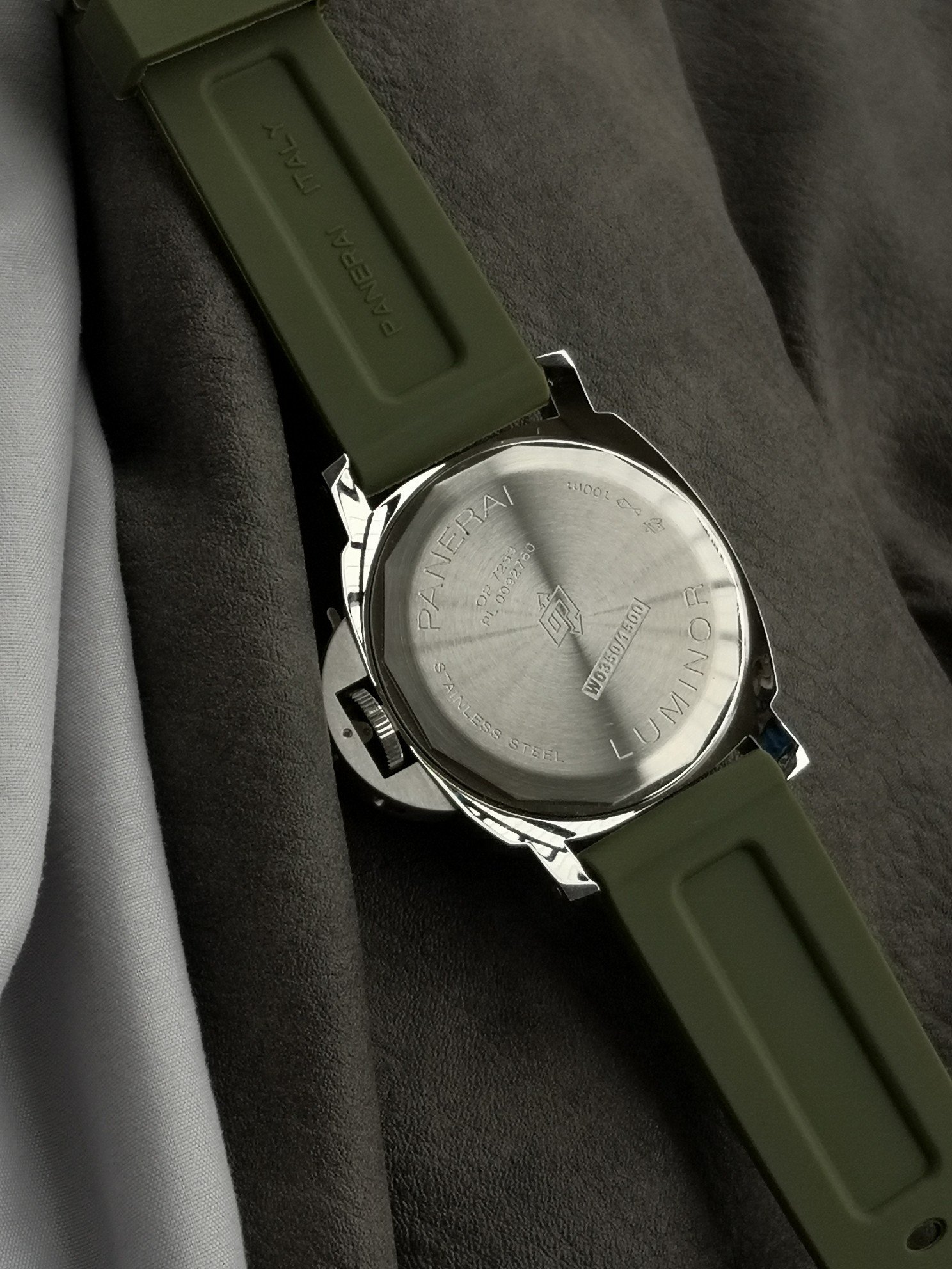 Super luminous, green rubber strap, 44mm diameter, white matte dial with polished stainless steel case, classic and simple, Panerai’s latest entry-level model.