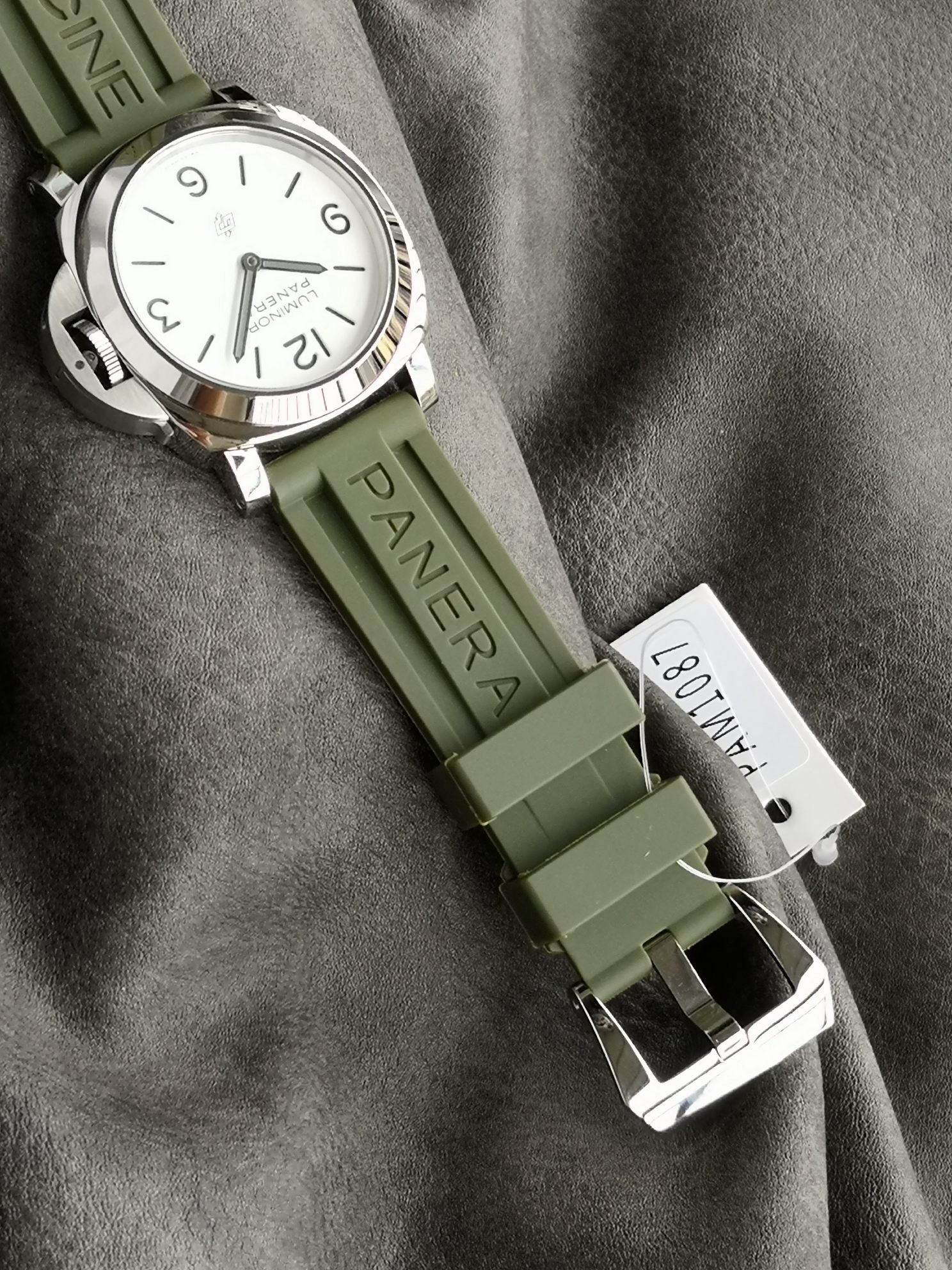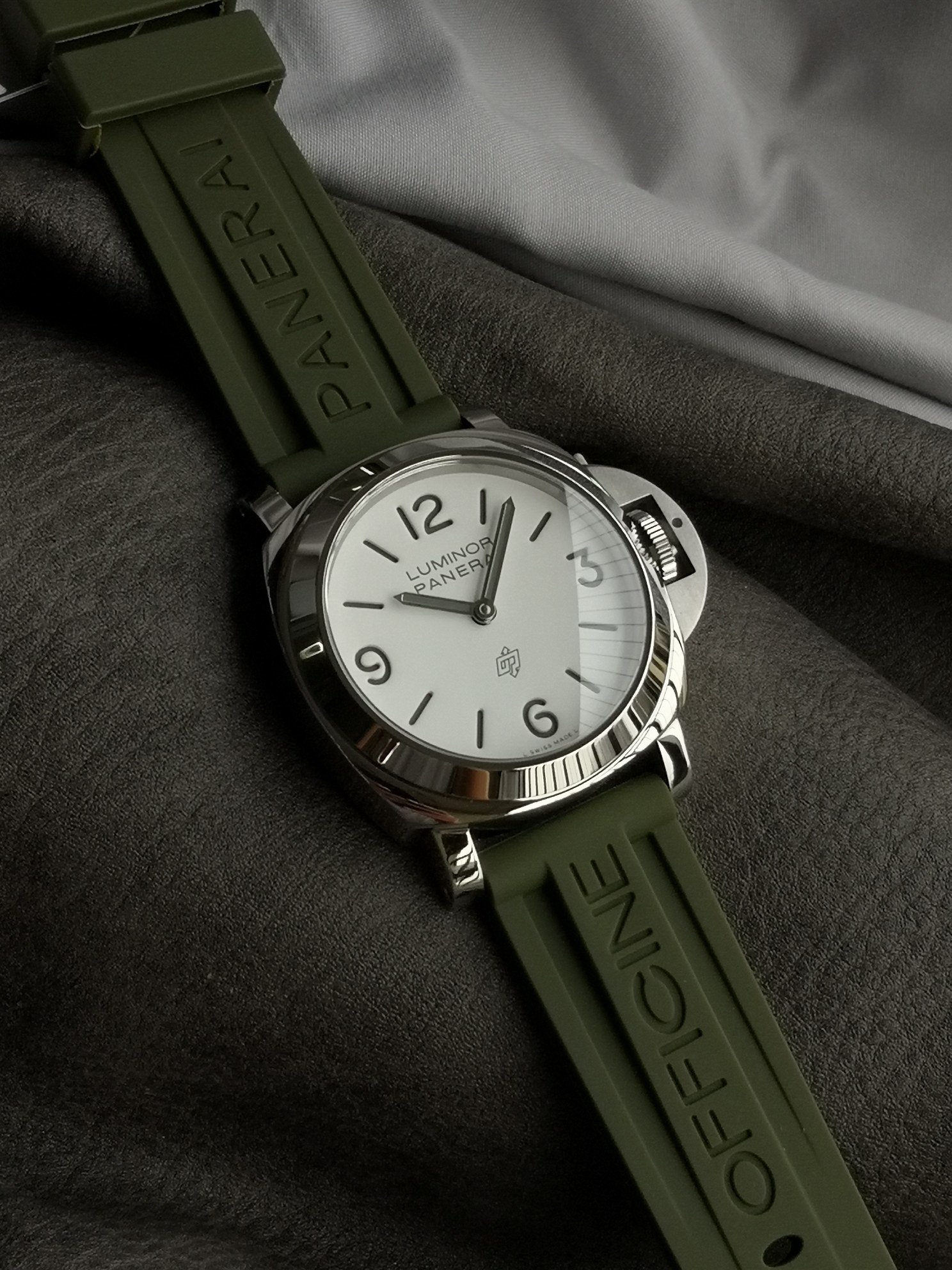 Super luminous, green rubber strap, 44mm diameter, white matte dial with polished stainless steel case, classic and simple, Panerai’s latest entry-level model.