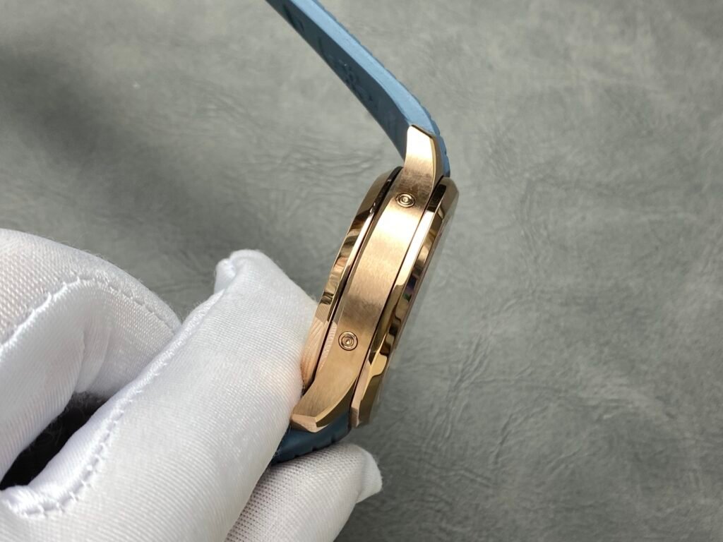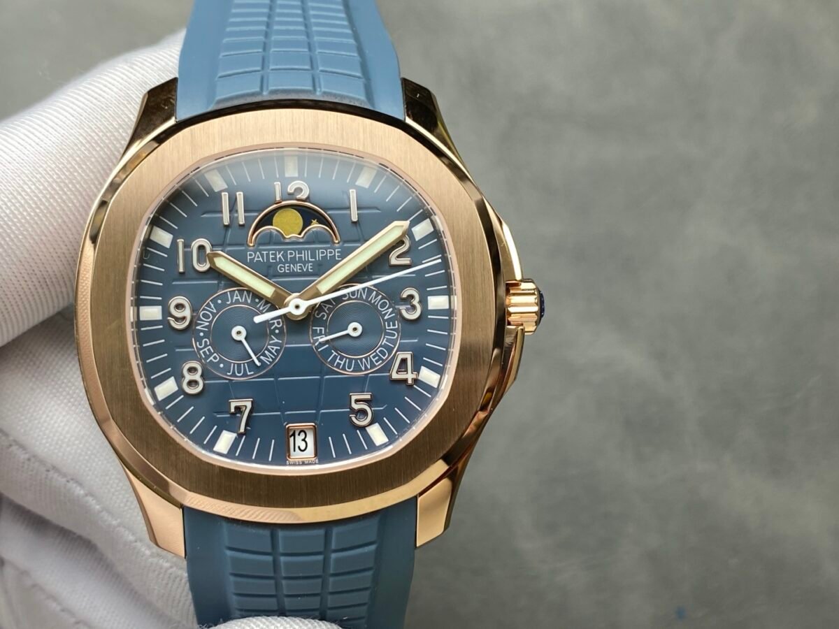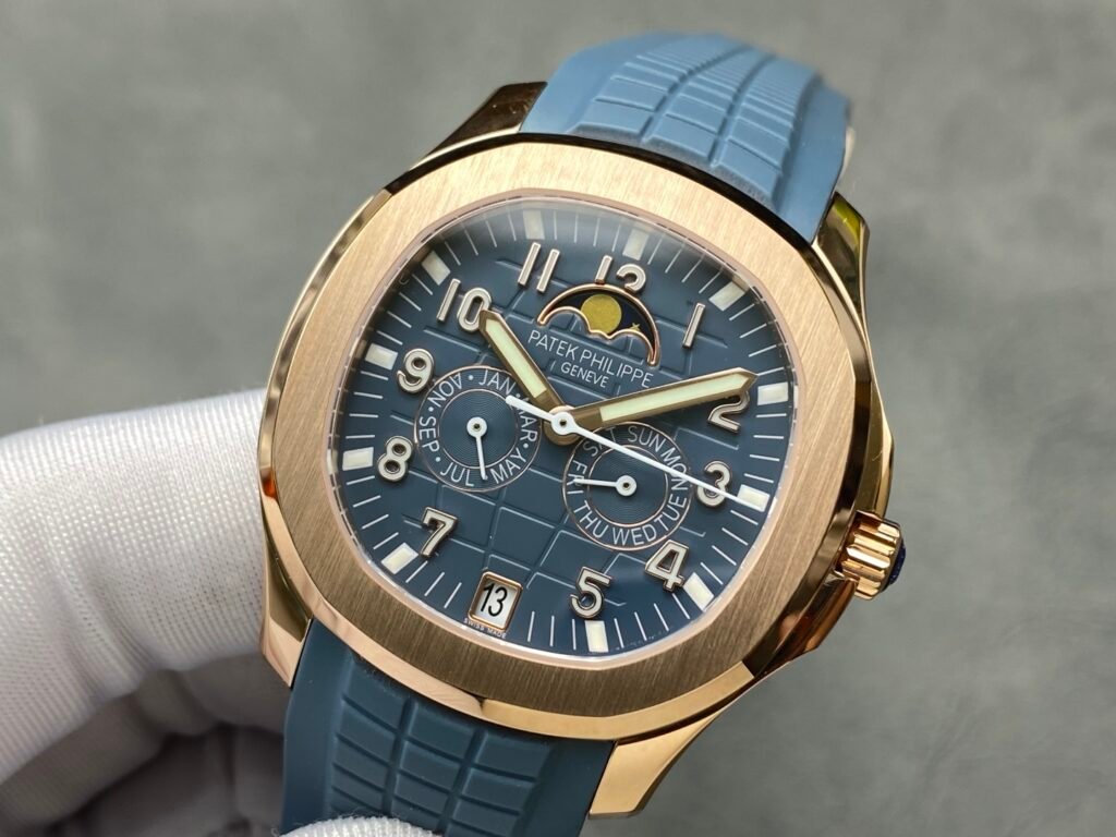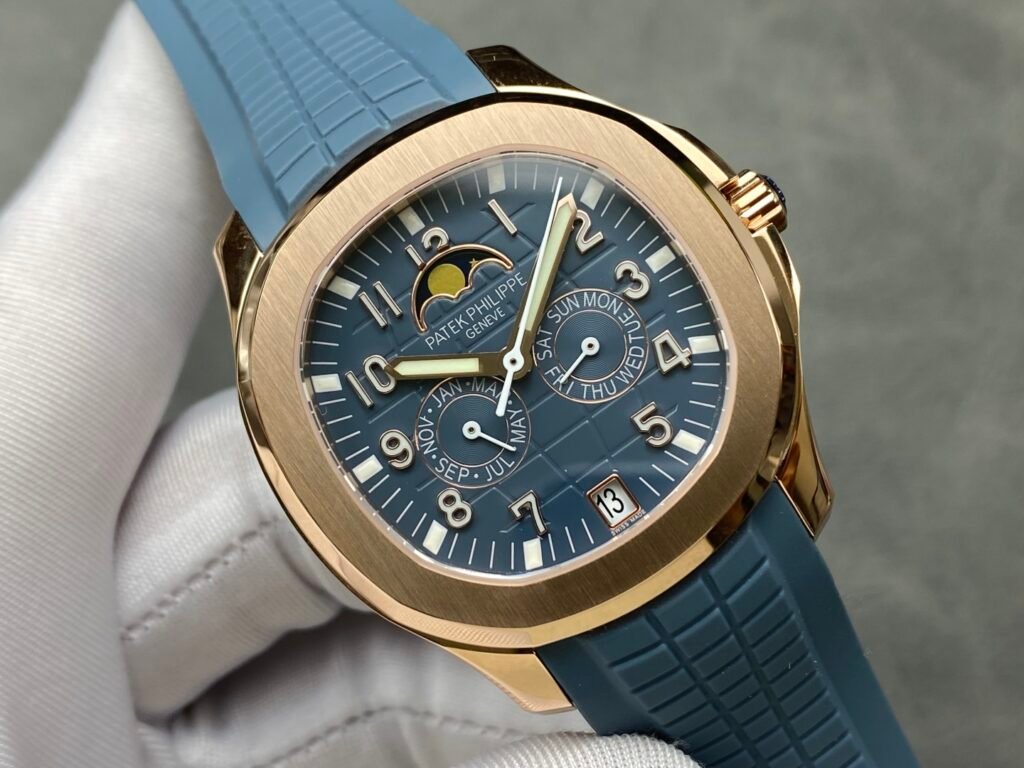 👌The case and bezel adopt the iconic arc octagonal shape, combined with contrasting polishing and satin treatment. The gray-blue dial and strap are decorated with Aquanaut relief patterns, and the Arabic numerals and baton-style hands are all covered with white fluorescent coating, which makes it easy to read at a glance.
