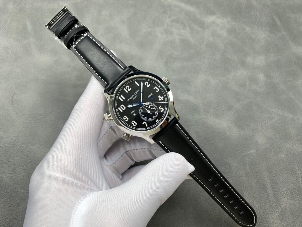 3: Replaceable 5205G lantern folding buckle PP Patek Philippe Multi-function Dual Time Zone Function ref.5524 Calatrava Pilot Travel Time Watch Series is stunningly launched! [Dial] Rose gold coffee dial and dark blue painted dial, the surface has a matte grain texture, exquisite and restrained, and the Arabic fluorescent coating font is also consistent with the original and has a three-dimensional sense, rendering the easy-to-read and rough style of the flight watch to the extreme. [Case] ​​The case is 42mm and 11mm thick, the workmanship is consistent with Patek Philippe’s consistent style, the case is completely mirror polished, smooth and delicate, enhancing its visual sense, and achieving the ultimate in details. [Function] The 5524 series is a 24-hour time watch. The six digits are the same as the original calendar, and the bottom of the center large second hand is a dual time zone time display, which is consistent with the original. [Strap and buckle] The buckle uses a triangular pin buckle that is consistent with the original, which is easy to wear and echoes the case, showing the overall aesthetics of this watch. It is matched with a blue leather strap and decorated with beige stitching. The texture is comfortable, and the cowhide also makes the whole watch more retro. As the first PP pilot watch, the 42 size also shows the tough guy style. It is also a sports style watch and an ideal wrist companion for business travelers.
