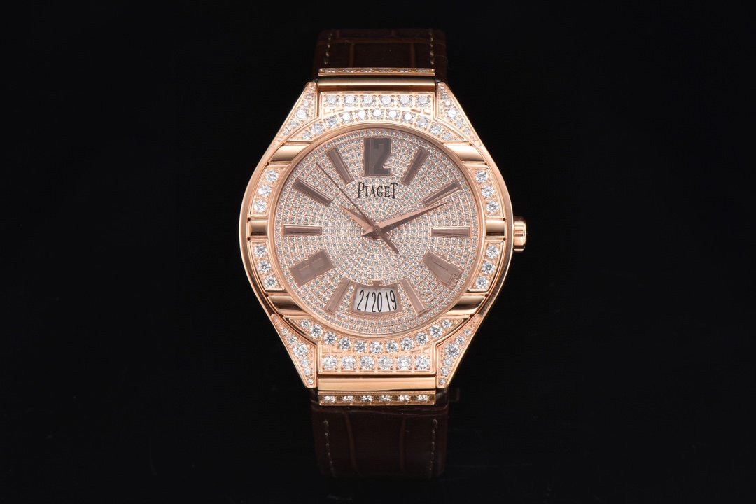 Extraordinary craftsmanship, encountering jewelry inspiration, challenging the limit of luxury—Piaget POLO series starry sky, shockingly launched. The watch uses a total of 564 top Swarovski diamonds, and the pillow-shaped case is plated with 18k real gold. Perfectly presenting the luxurious and brilliant style of the authentic product. [Case] ​​The pillow-shaped case is matched with a slightly curved shoulder. Each finished case is carefully selected by QC inspectors and then processed by jewelry inlay. In order to achieve the original effect (neat, uniform inlay style). The 78 top artificial diamonds on the case must be completed by a jewelry inlay master in one go. [Dial] The valuable dial has a total of 486 top Swarovski. The size, cut and fire of the gems are strictly screened to ensure consistency. 12 fine scale marks are cut and formed by CNC, and then patiently polished by the watchmaker, and finally inlaid. [Movement] 9015 modified Piaget 800P movement, durable and stable quality. [Watch strap buckle] The embedded watch strap is closely connected to the watch shoulder, making the wearer feel more comfortable and fit. Exquisitely recommended men’s mechanical watches are carefully created for you to shoot ultra-realistic pictures