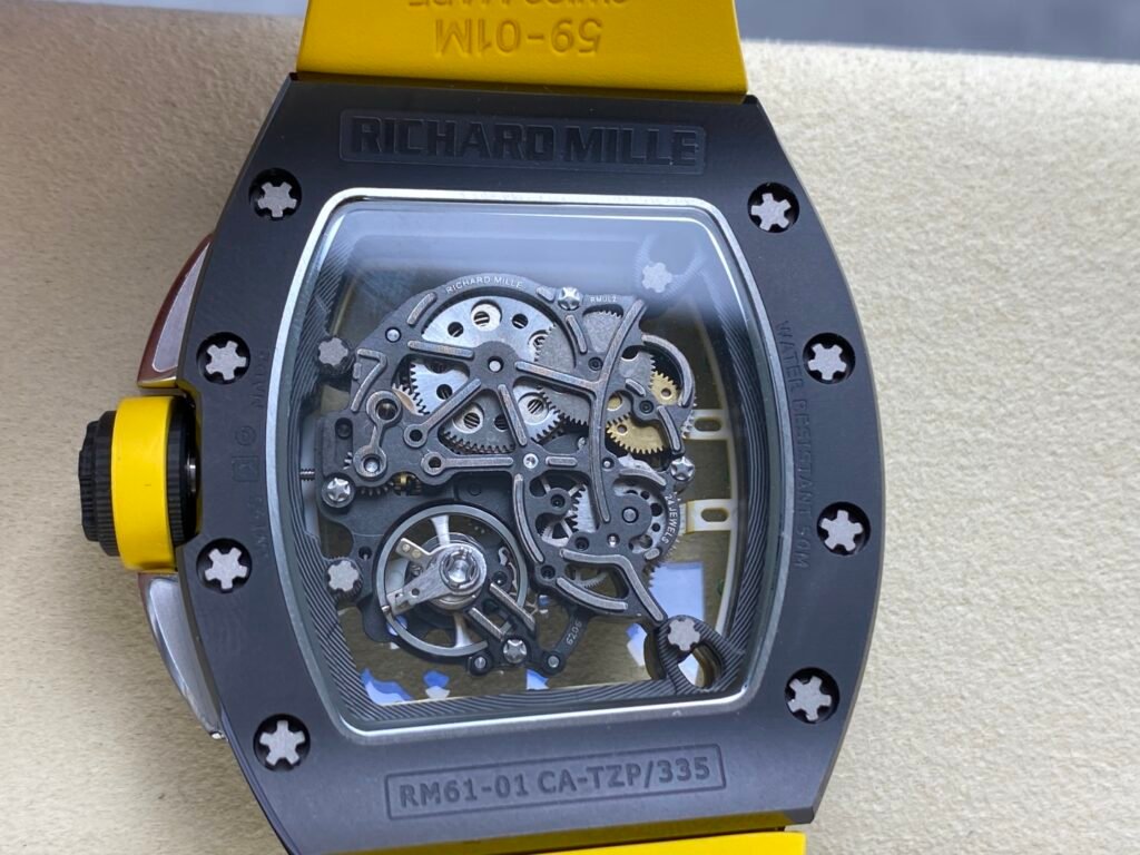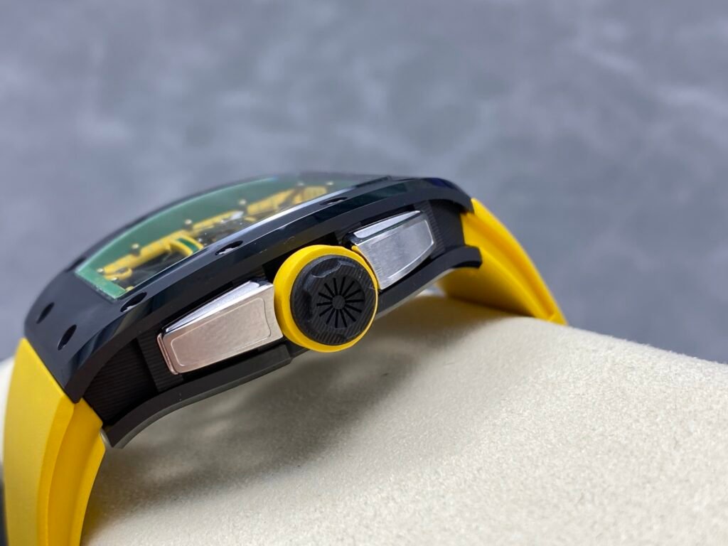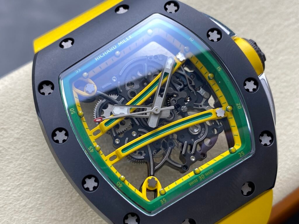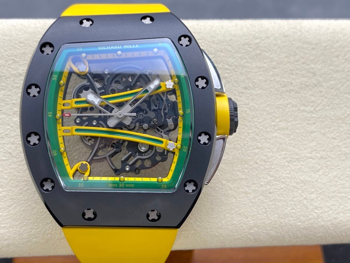 “RICHARD MILLE” Richard RM61-01 integrated movement, the cover and bottom cover are made of TZP-N zirconium oxide ceramic, and the middle case is NTPT carbon fiber. The bezel and bottom cover of the barrel case are made of ultra-hard and ultra-light TZP-N zirconium oxide ceramic, the middle layer is ultra-light and impact-resistant NTPT carbon fiber, and the 3-point large-size carbon fiber crown. The entire case is waterproof to 50 meters, which is enough to meet daily sports needs. The open hollow dial design can see the operation of the movement and the tightness of the barrel. The entire Caliber RMUL2 movement is fixed on the yellow-green suspended bridge plate-the plate and the inner bezel with minute scales are made of titanium metal, which is hand-plated and colored to form a strong contrast with the black movement. RMUL2 is a manual winding movement with a power storage of 55 hours. The movement plate is made of grade 5 titanium + PVD black treatment, which has a better appreciation effect when viewed from the back of the watch. Case: 51mm diameter, 14mm thick, sapphire crystal, carbon fiber crown, RMUL2 manual mechanical movement, 24 jewels, 28,800 beats/hour, titanium buckle, 55 hours power reserve, rubber strap, 50 meters waterproof.