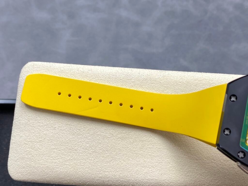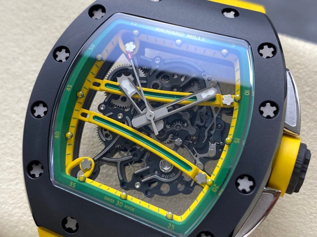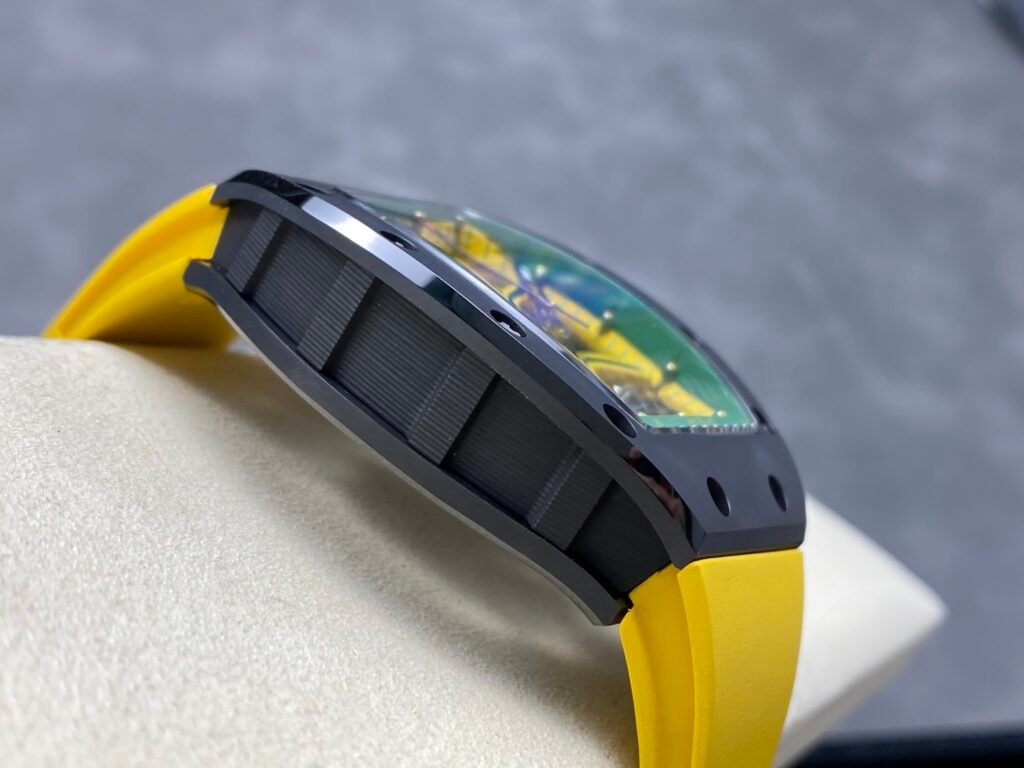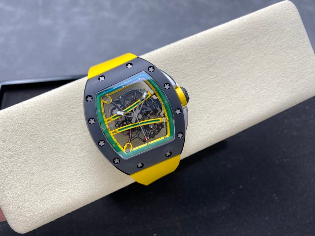 “RICHARD MILLE” Richard RM61-01 integrated movement, the cover and bottom cover are made of TZP-N zirconium oxide ceramic, and the middle case is NTPT carbon fiber. The bezel and bottom cover of the barrel case are made of ultra-hard and ultra-light TZP-N zirconium oxide ceramic, the middle layer is ultra-light and impact-resistant NTPT carbon fiber, and the 3-point large-size carbon fiber crown. The entire case is waterproof to 50 meters, which is enough to meet daily sports needs. The open hollow dial design can see the operation of the movement and the tightness of the barrel. The entire Caliber RMUL2 movement is fixed on the yellow-green suspended bridge plate-the plate and the inner bezel with minute scales are made of titanium metal, which is hand-plated and colored to form a strong contrast with the black movement. RMUL2 is a manual winding movement with a power storage of 55 hours. The movement plate is made of grade 5 titanium + PVD black treatment, which has a better appreciation effect when viewed from the back of the watch. Case: 51mm diameter, 14mm thick, sapphire crystal, carbon fiber crown, RMUL2 manual mechanical movement, 24 jewels, 28,800 beats/hour, titanium buckle, 55 hours power reserve, rubber strap, 50 meters waterproof.