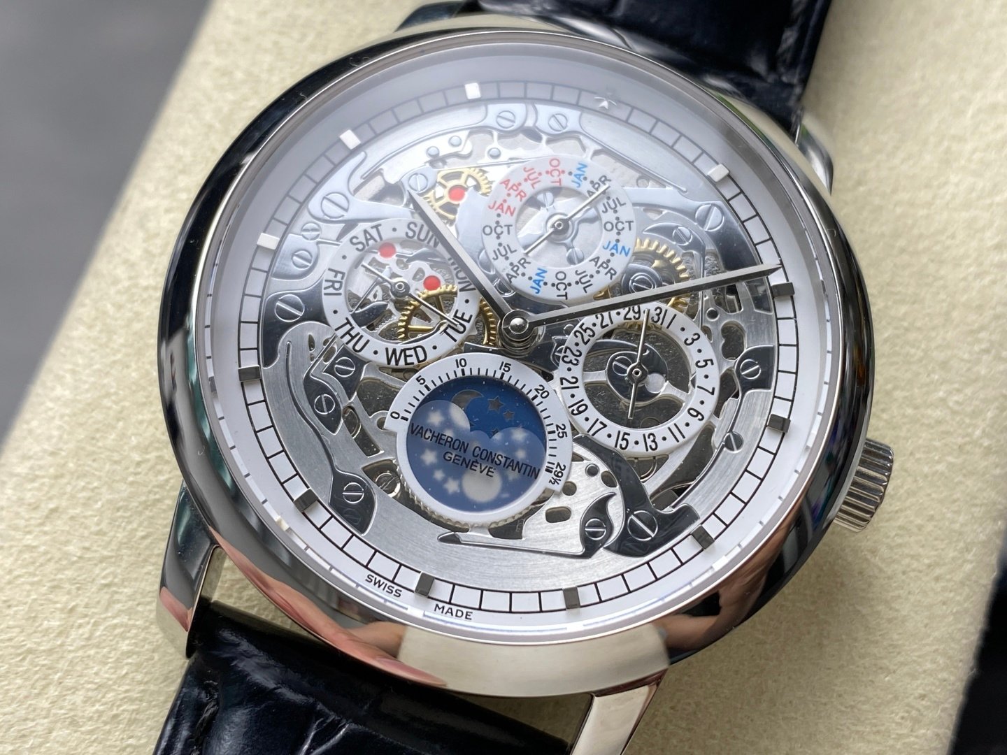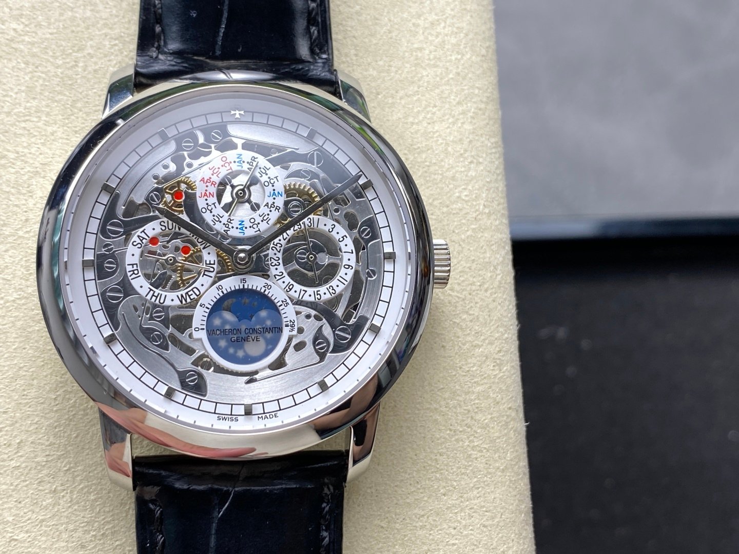 Multifunction model: 43175/000R-9687. This watch exemplifies Vacheron Constantin’s tradition of superb horological complications, with the ultra-thin model being a true exemplar. 1: Equipped with a movement identical to the original, the balance wheel is entirely consistent with the authentic piece, and all functions operate normally. 2: Improvements made to the curvature of the four corners of the case, and the dial colour curvature is more fitting; the twelve markers are more finely polished, bringing it closer to a boutique standard! 3: Crafted with Italian leather for a more comfortable fit on the wrist! With the full moon during the Mid-Autumn Festival, one might as well indulge in daydreams. Regardless of time having passed halfway, suddenly, there is a sparkling clarity of stars, accompanied by the timelessness of a thousand years, cascading onto the hand. Light and shadow fleeting, moments intertwine. Suitable for various business occasions, understated elegance without losing sophistication! High-quality replica, please enjoy!