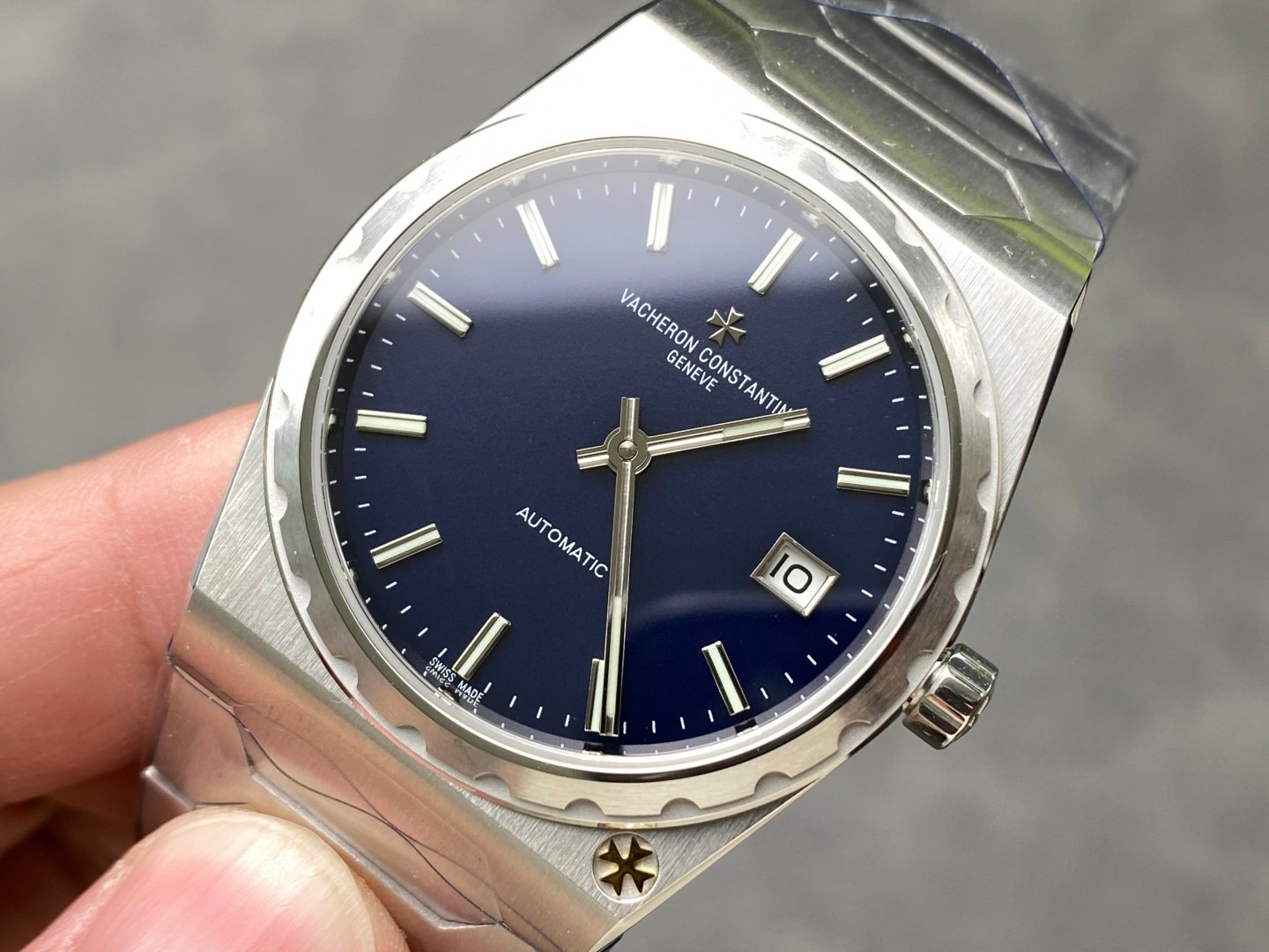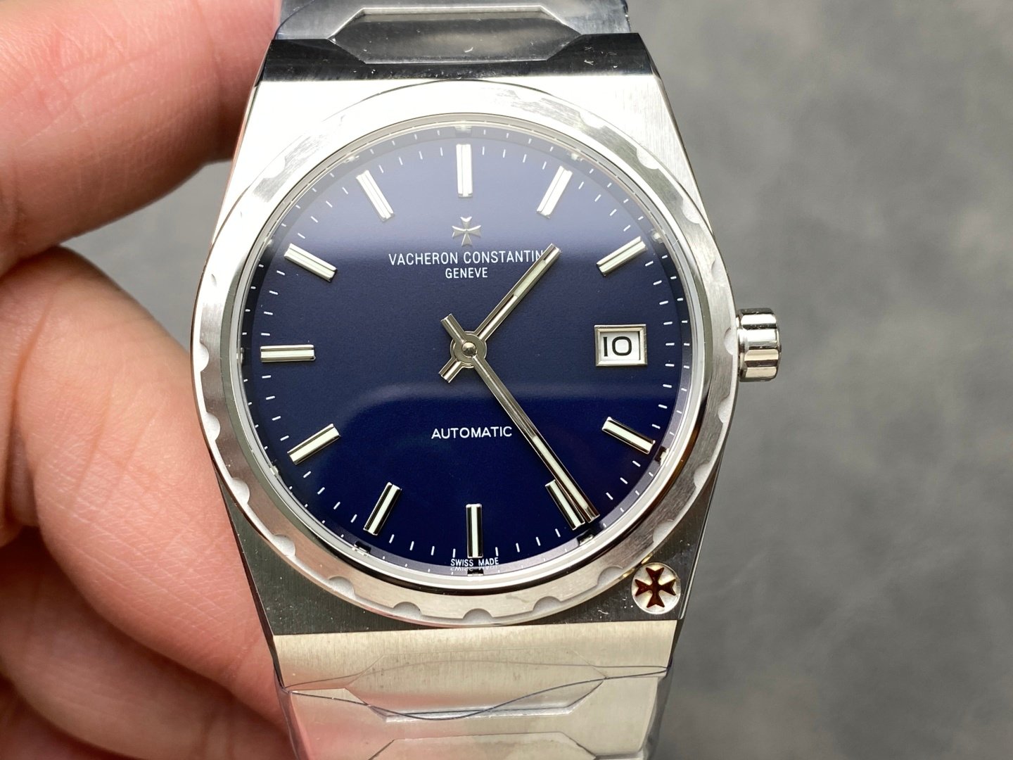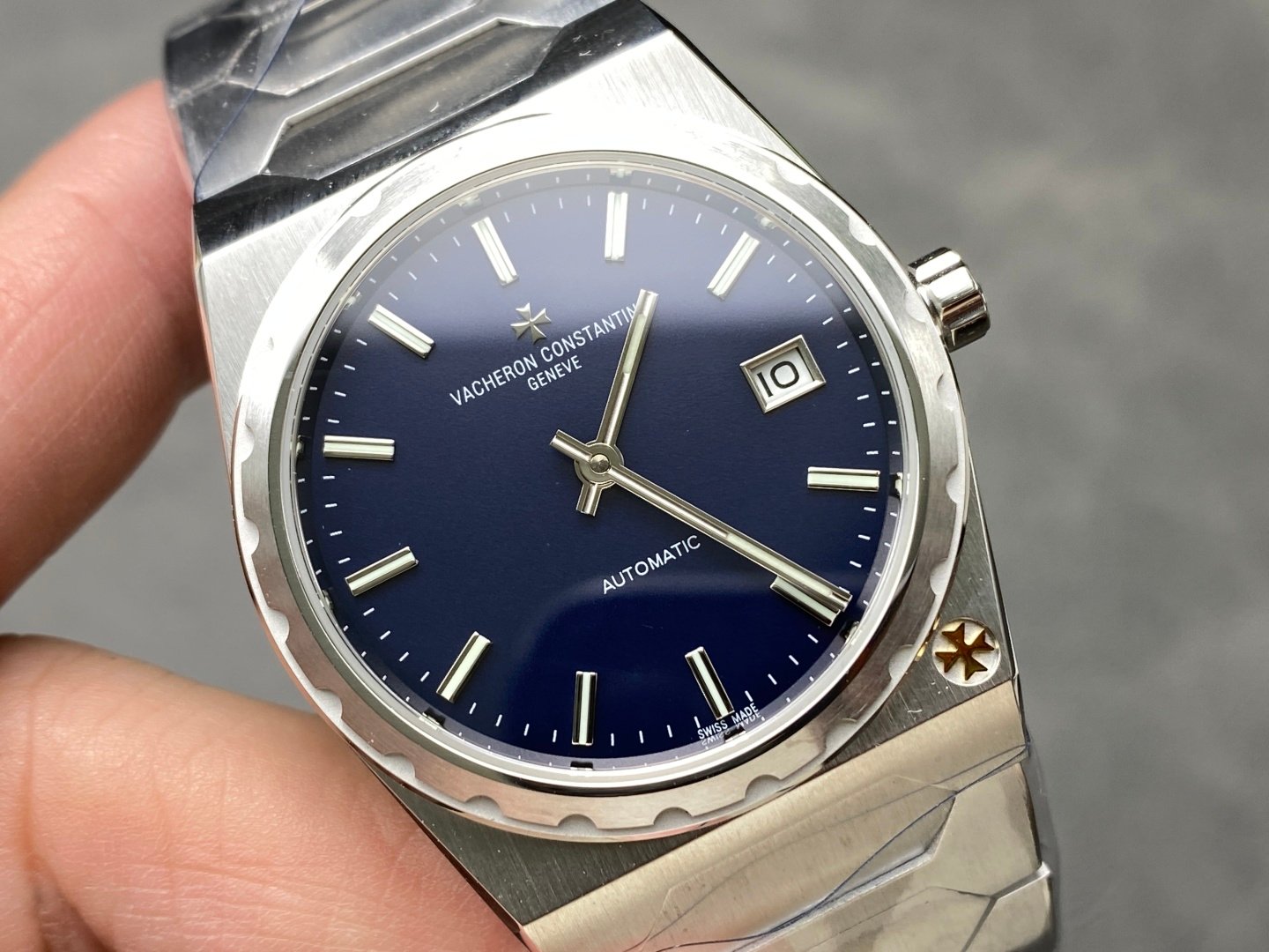 Case: The tonneau-shaped three-part structure makes the whole not small, and the fluted bezel with the Maltese cross at 5 o’clock gives it a sense of prestige Dial: Gold. Rose gold. Brushed silver and brushed grey are combined with brushed metallic bar indexes and baton hands with luminescent coating, retaining the most classic second hand Movement: The same movement imported from Switzerland. From the splint to the steel wheel and other parts are delicately decorated, the automatic pendulum is plated with 22K gold and engraved with 222 fonts Strap: An integrated hexagonal central link gives the watch an angular and timeless elegance.